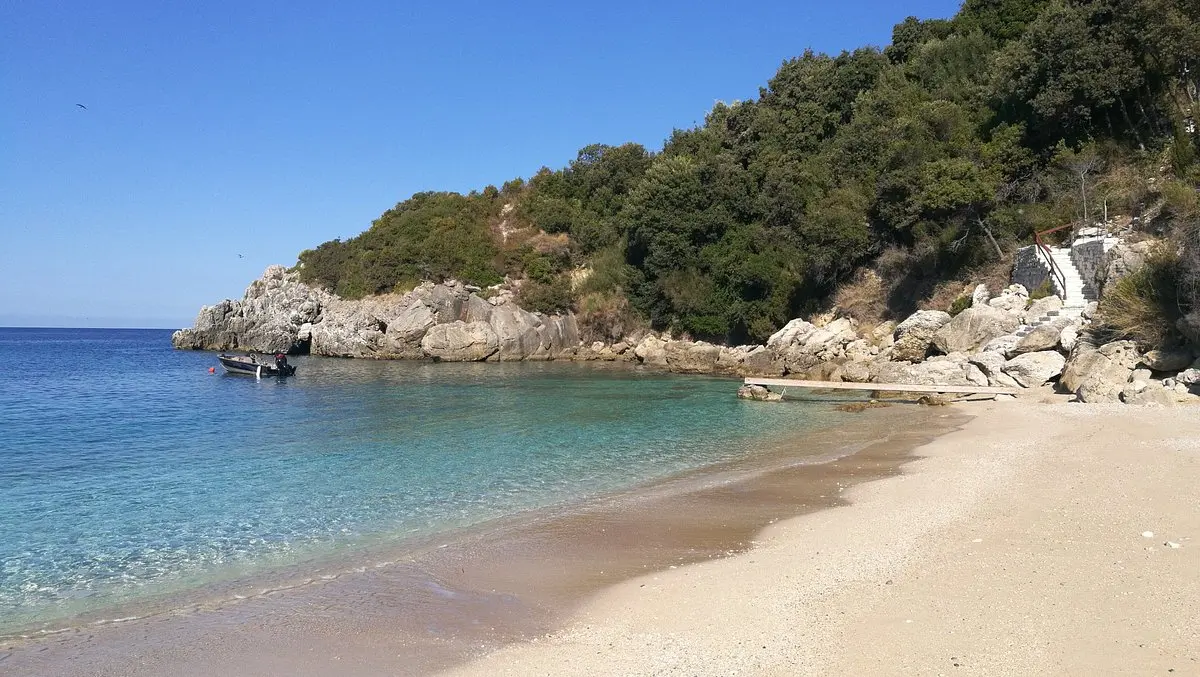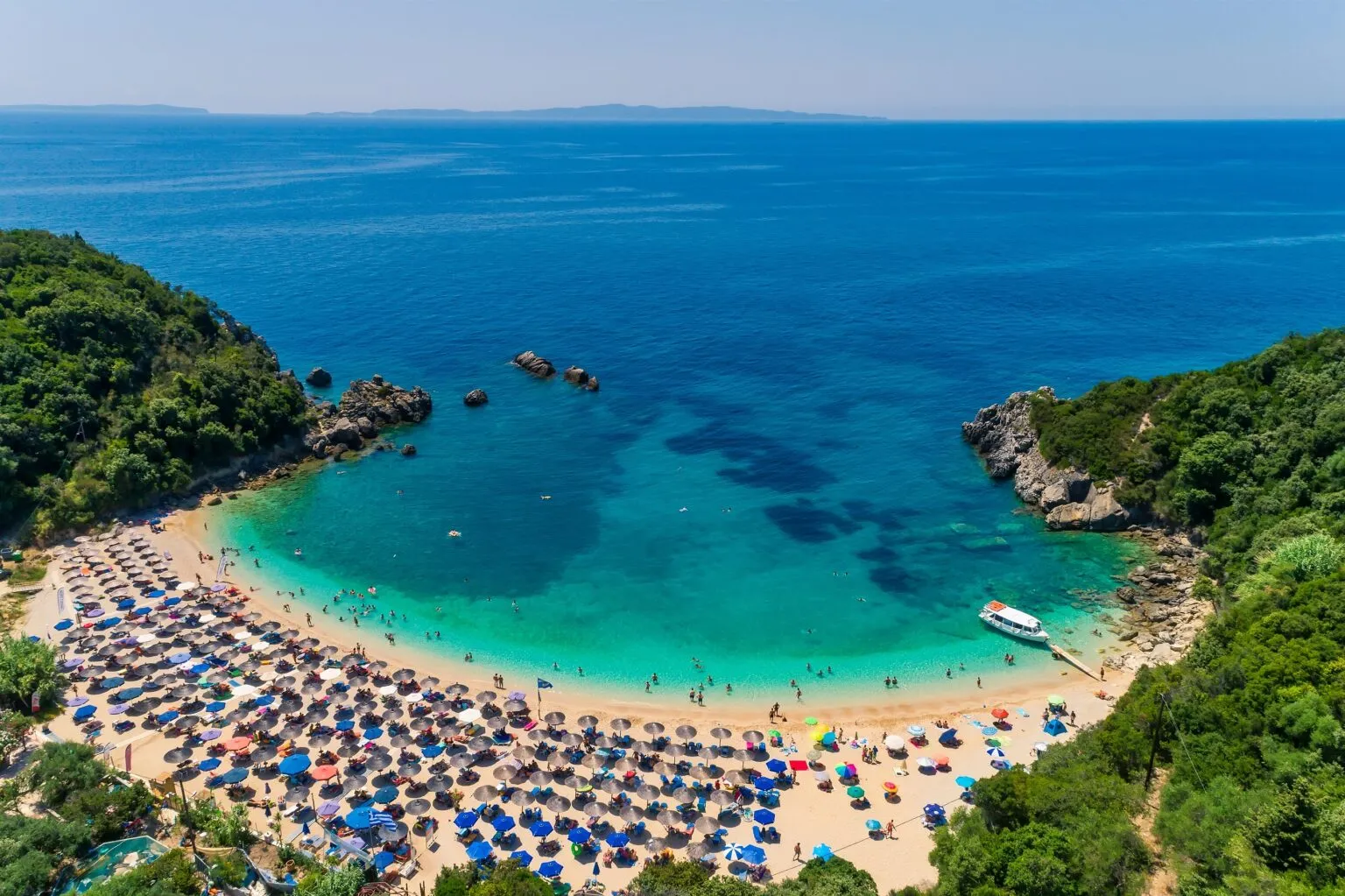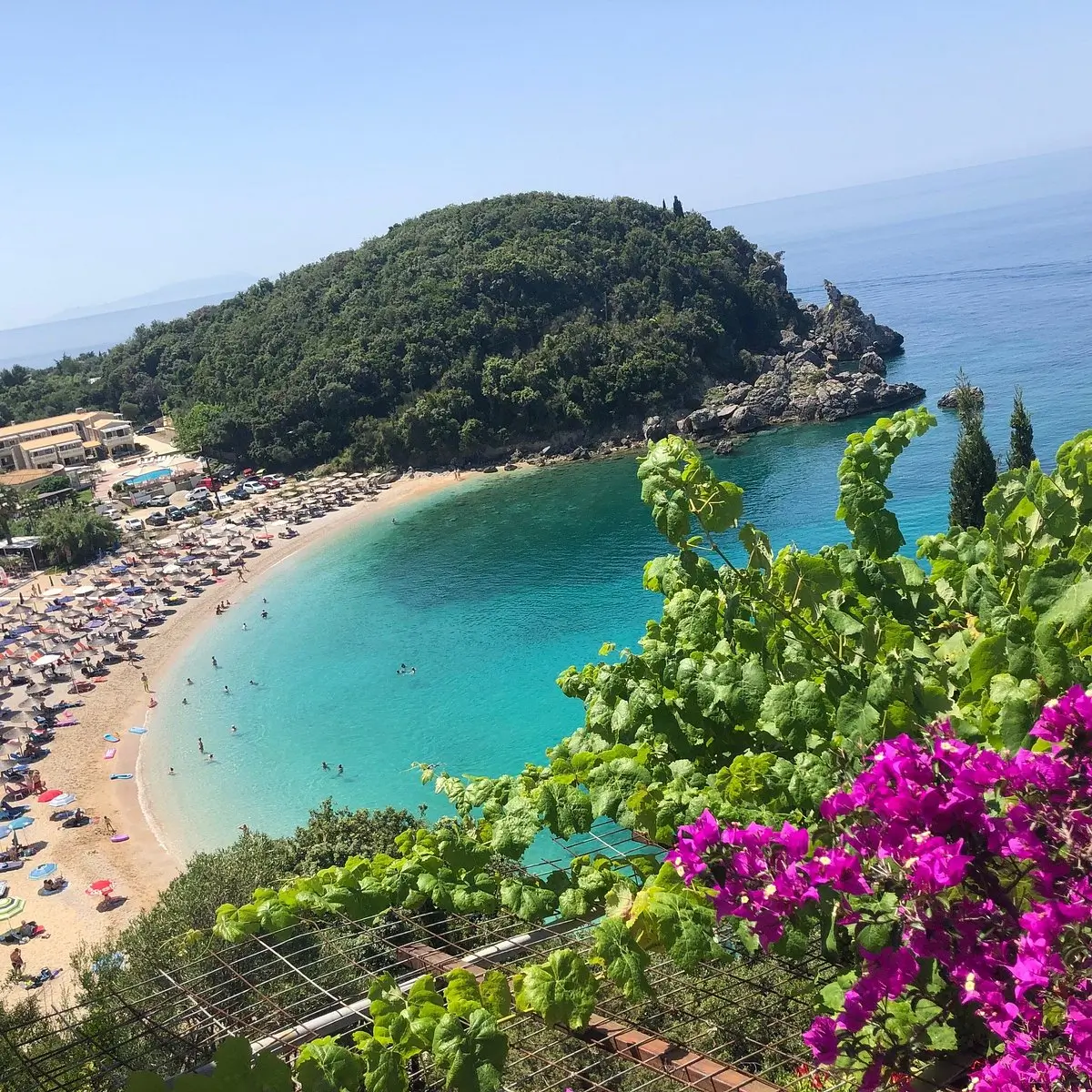 Sarakiniko Beach is a beautiful, crescent-shaped bay a short drive from Parga, known for emerald waters, coarse sand and pebbles, and a relaxed atmosphere. Sheltered by green hills and rocky headlands, it offers a more tranquil setting than Parga’s town beaches.